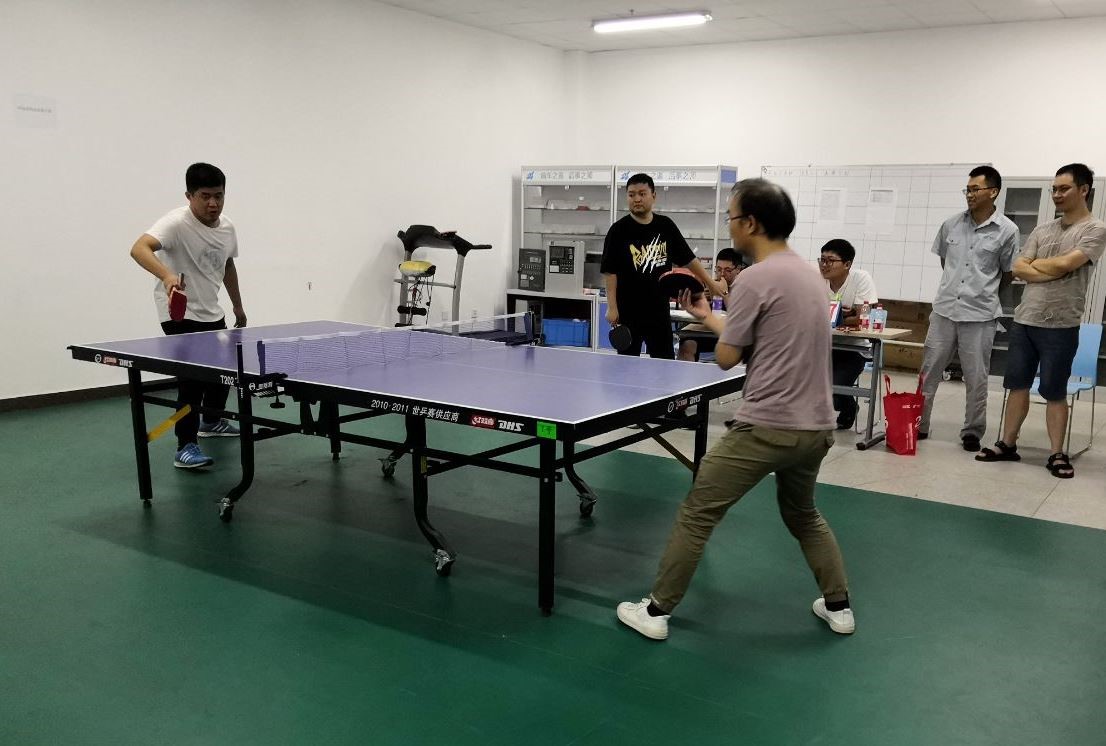 下午進(jìn)行的團(tuán)體比賽,現(xiàn)場氣氛進(jìn)入了高潮。本次比賽規(guī)則規(guī)定,男女對打時,在每一局開始時,女選手以8:0開始,雙打有女選手的一方以6:0開始,與女選手比賽時,男選手壓力非常大,每一局都緊張刺激,現(xiàn)場觀眾給雙方加油聲不斷。最終,按照決賽積分排名,研發(fā)一隊(duì)(翟耀、王建軍、桓宗圣)獲得第一名,研發(fā)二隊(duì)(方宜海、王立龍、龐傳道)獲得第二名。