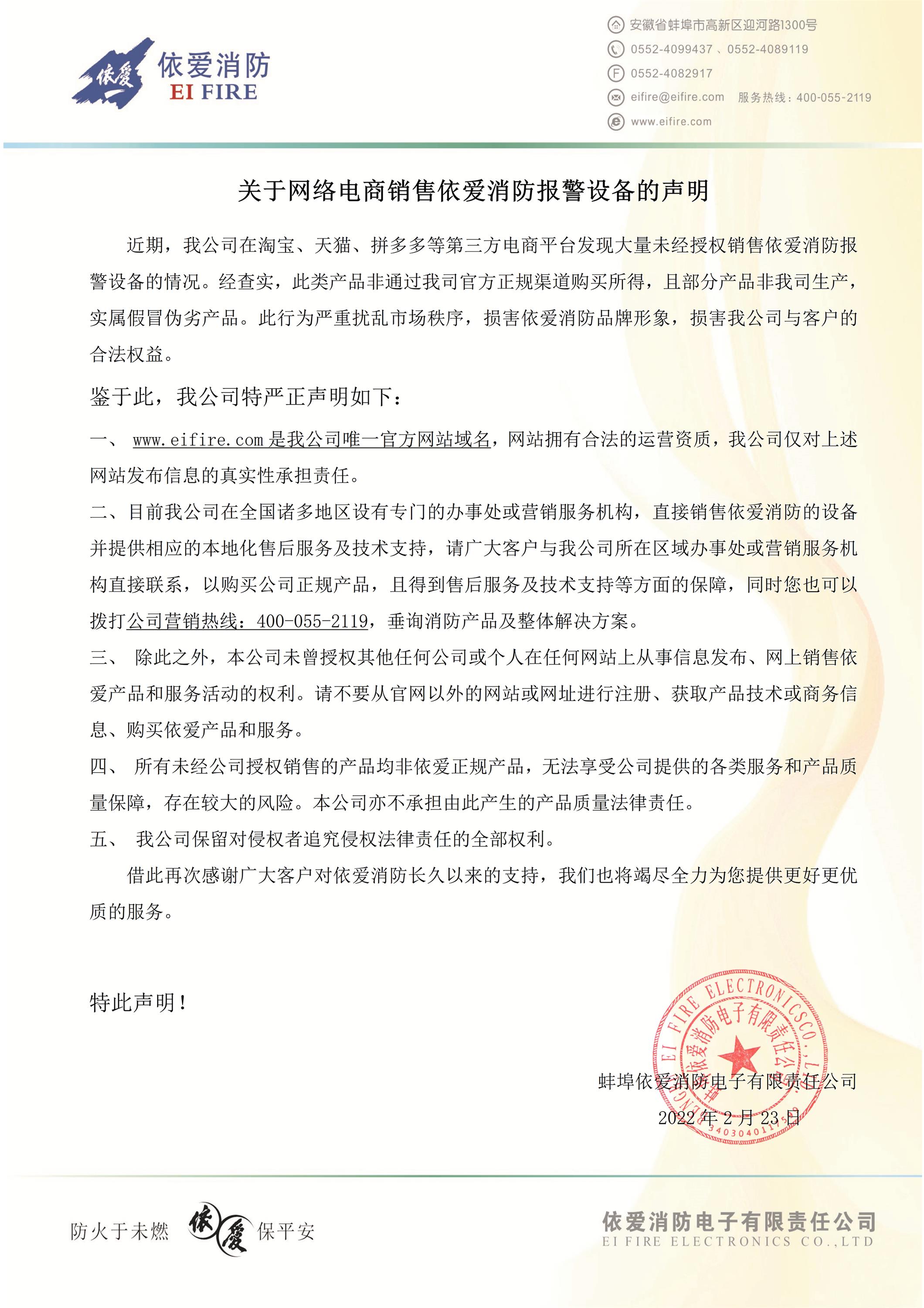 重要通知!關(guān)于網(wǎng)絡(luò)電商銷售依愛消防報警設(shè)備的聲明