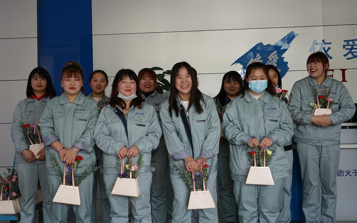 活動當天上午,各部門女員工代表前往A12廠房一樓大廳,領(lǐng)取了婦女節(jié)的慰問品和鮮花。并合影留念。